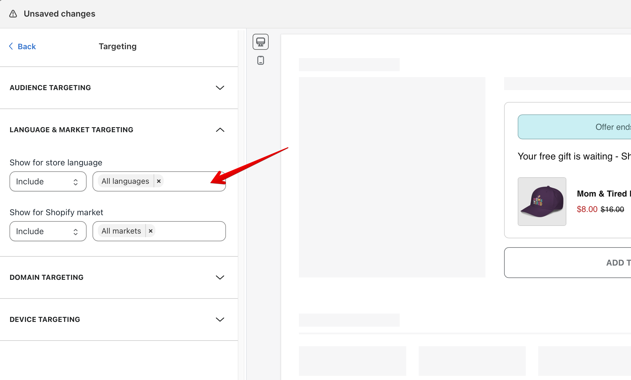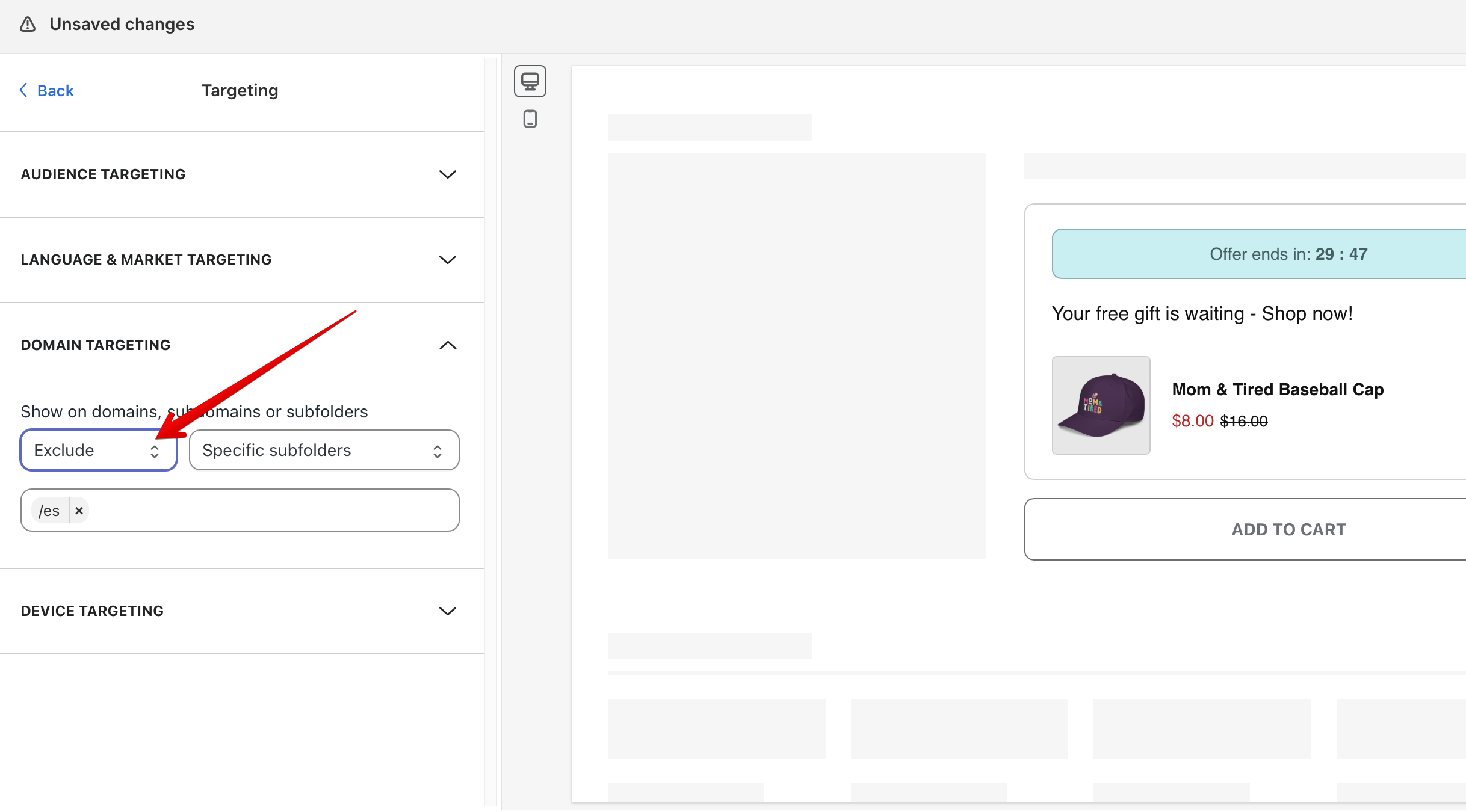 Alternatively, if you're not using Shopify's default translation methods, you can use our targeting feature to manually display each offer only on its corresponding language-specific URL.